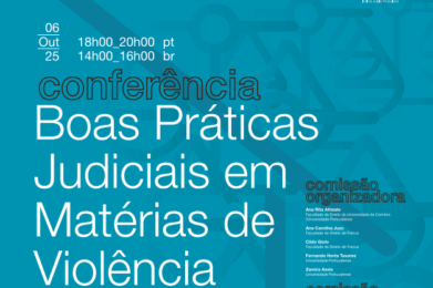 Boas Práticas Judiciárias em Matéria de Violência Doméstica No dia 6 de outubro, às 18h00, terá lugar, em formato online, a conferência Boas Práticas Judiciárias em Matéria de Violência Doméstica, promovida no âmbito do projeto “Estudos sobre Mulheres, Género e Interseccionalidade” (IJP – Grupo de Investigação Pessoas). Oradores: – Frederico Moyano Marques (APAV – Associação Portuguesa de Apoio à Vítima) – Teresa Cristina Cabral Santana (Tribunal de Justiça do Estado de São Paulo) – Luiza Cristina de Castro Faria (Centro Universitário UniProcessus) Inscrições Boas Práticas Judiciárias em Matéria de Violência Doméstica