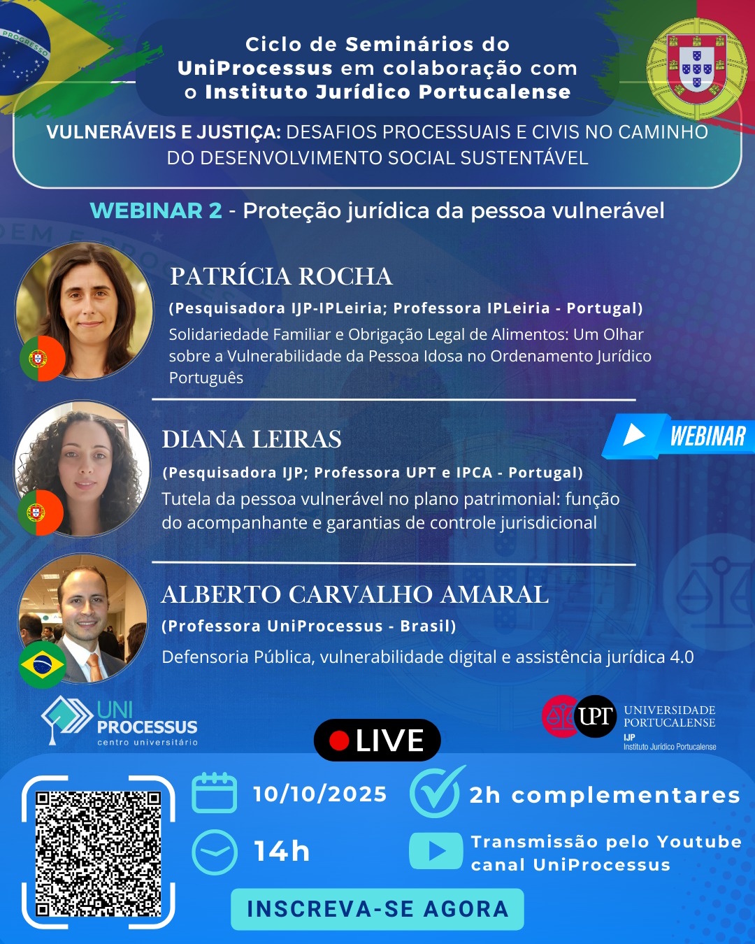 No âmbito do ciclo de seminários “Vulneráveis e Justiça: Desafios Processuais e Civis no Caminho do Desenvolvimento Social Sustentável”*, realizado em parceria com o Instituto Jurídico Portucalense (IJP), terá lugar, na próxima sexta-feira, dia 10 de outubro, o 2.º painel: “Proteção jurídica da pessoa vulnerável: família, património e acesso à justiça”.