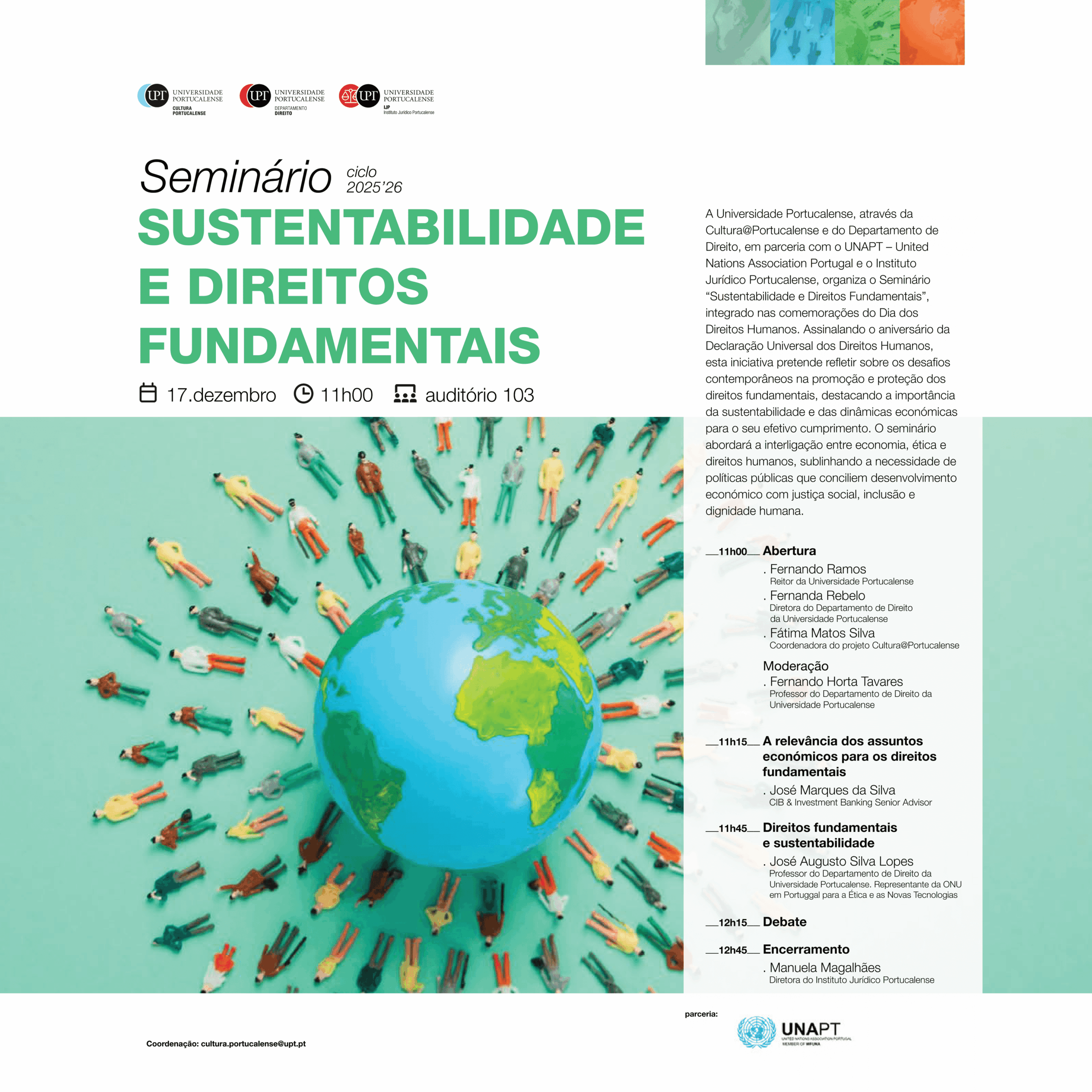 O Instituto Jurídico Portucalense assinala o Dia Internacional dos Direitos Humanos, celebrado a 10 de dezembro, convidando para o Seminário “Sustentabilidade e Direitos Fundamentais”, que terá lugar no dia 17 de dezembro, na Universidade Portucalense, a partir das 11h00 (Auditório 103).